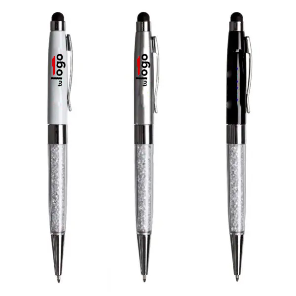 Los Bolígrafos Cristal Win son bolígrafos Touch, tienen cuerpo de color blanco, metalizado o de color negro y vienen rellenos de delicados cristales brillantes. El clip es metálico y la puntera es de color metalizado. Tiene apertura por giro y cartucho de Tinta standard de escritura negra.